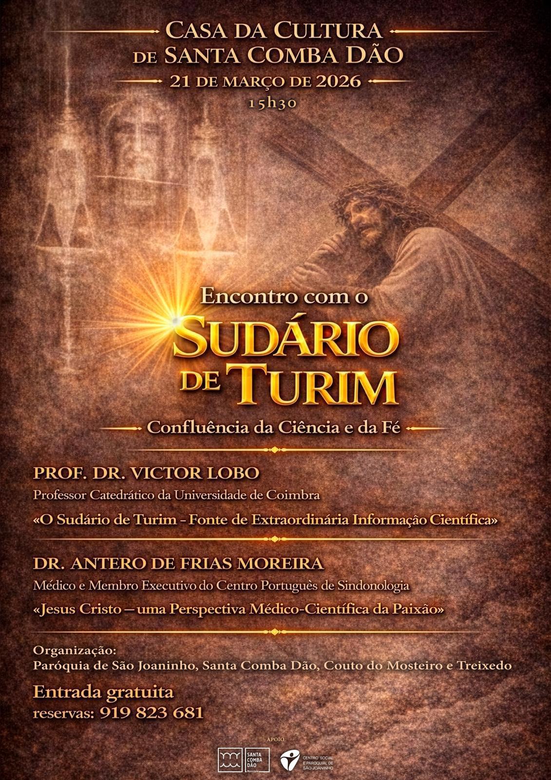Santa Comba Dão, 16 mar 2026 (Ecclesia) – As paróquias de São Joaninho, Santa Comba Dão, Couto do Mosteiro e Treixedo, da Diocese de Viseu, promovem hoje uma sessão sobre o tema “Encontro com o Sudário de Turim – Confluência da Ciência e da Fé”, a partir das 15h30.